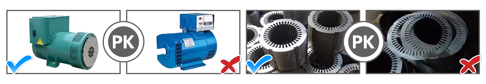 مولد كهربائي بدون فرشاة مصنوع من أسلاك النحاس بنسبة 100% أو مولد كهربائي أصلي من شركة STAMFORD. | مولد كهربائي بالفرشاة بجودة منخفضة. | استخدم صفائح الفولاذ السيليكونية المدرفلة على البارد عالية الجودة | استخدم صفائح الفولاذ السيليكونية المدرفلة على الساخن ذات الجودة المنخفضة |